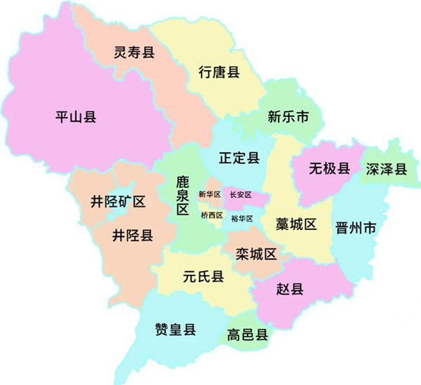 石家莊 長安區、橋西區、新華區、井陘礦區、裕華區、藁城區、鹿泉區、欒城區、辛集市、晉州市、新樂市、井陘縣、正定縣、行唐縣、靈壽縣、高邑縣、深澤縣、贊皇縣、無極縣、平山縣、元氏縣、趙縣 |