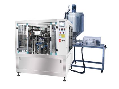 包裝物料: 300型給袋式全自動液體包裝機組特別適合計量包裝液體、膏體類的物料,如:純凈水、火鍋底料、防水涂料、豆沙醬、建筑膠水等液體、膏體類物料。